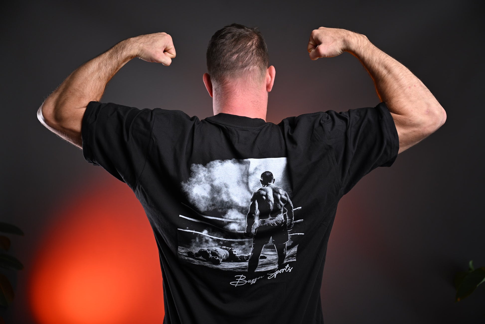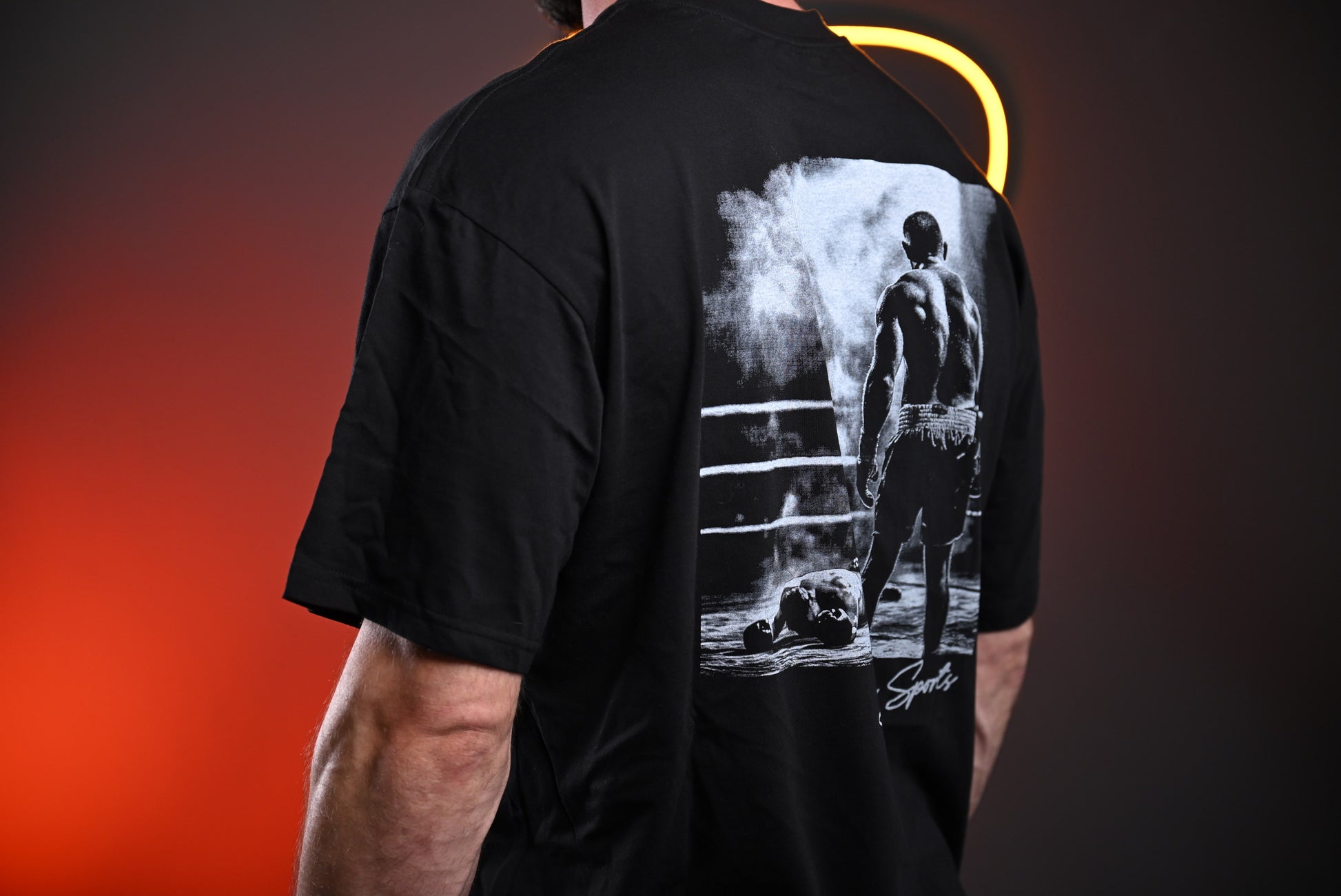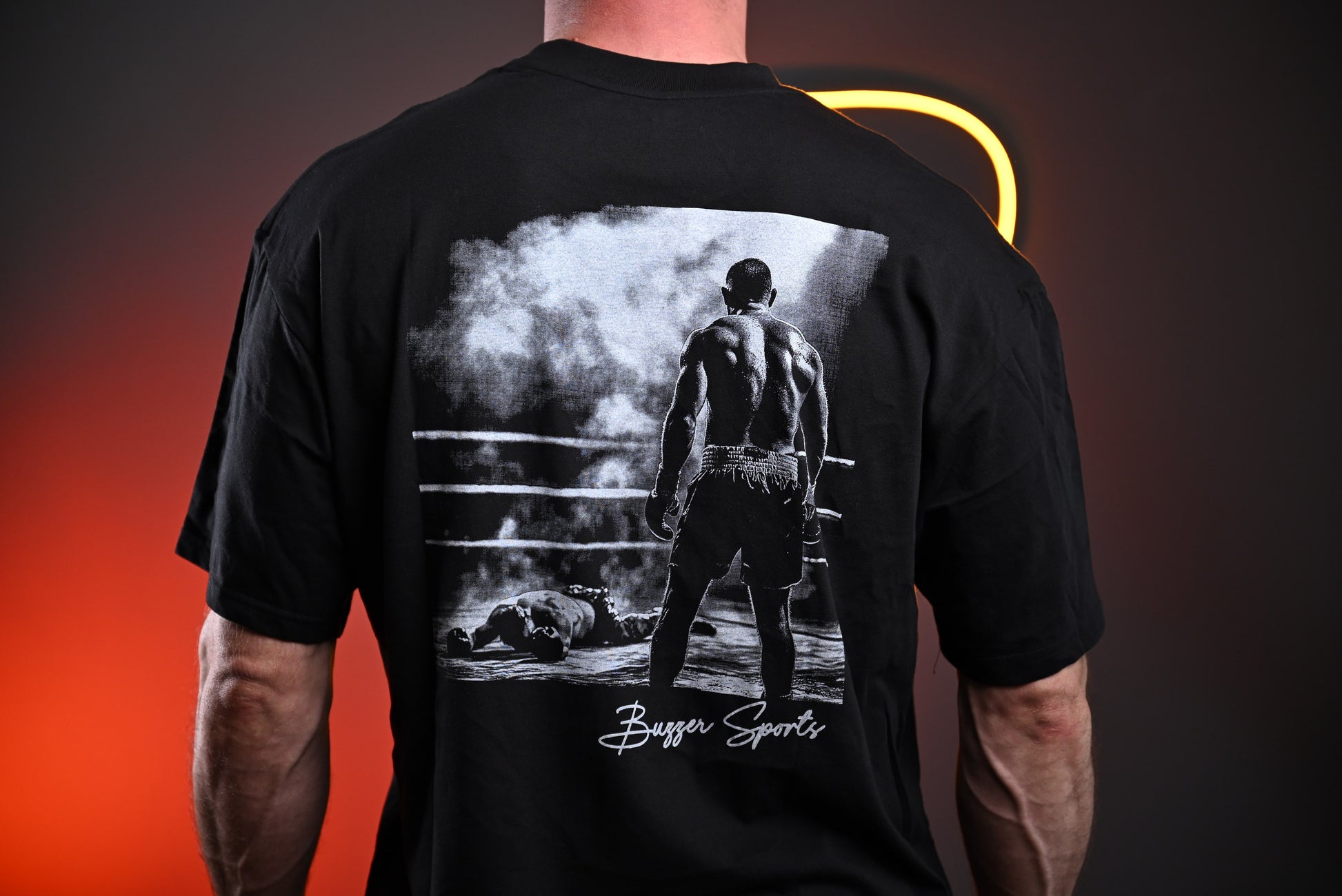 Majica koja nosi energiju borbe. Buzzer Oversized T-Shirt — Fighter Edition spaja udoban oversized kroj sa upečatljivom grafikom borca u kvalitetnom printu. Dovoljno je bold da bude centar outfita, a dovoljno jednostavno da ide uz šorc, farmerke ili baggy trenerku.